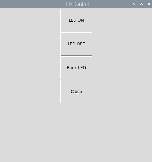 app = App(title="LED Control") button1 = PushButton(app, command=switch_on, text="LED ON", width=10,height=3) button2 = PushButton(app, command=switch_off, text="LED OFF", width=10,height=3) button3 = PushButton(app, command=blink_LED, text = "Blink LED", width=10,height=3) button4 = PushButton(app, command=close_gui, text="Close", width=10, height=3) app.display()