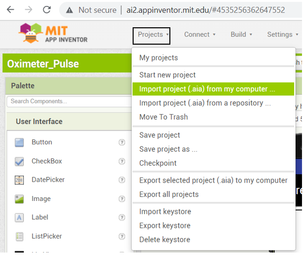 من قائمة Project اختر Import projects (.aia) from my computer ثم انقر على الملف الذي حملته مسبقًا ويحتوي على واجهة المستخدم والكود البرمجي.