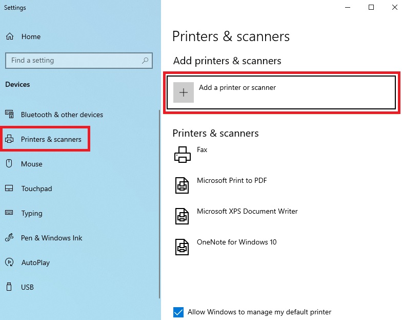 في خانة البحث اكتب الطابعات أو Printers انقر عليها وانقر على إضافة طابعة أو Add a Printer or scanner.