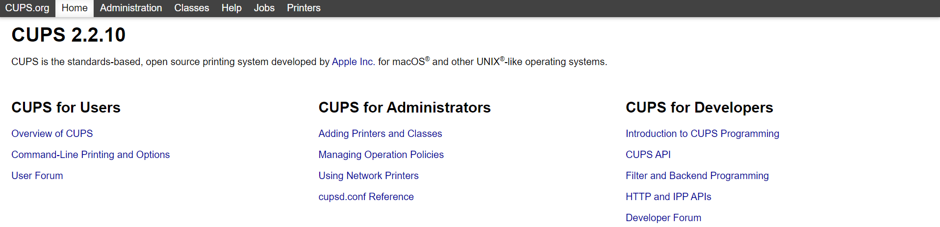 CUPS هو نظام طباعة مفتوح المصدر يستخدم بروتوكول الطباعة عبر الإنترنت (IPP) لدعم الطباعة على الطابعات المتصلة بالشبكة.