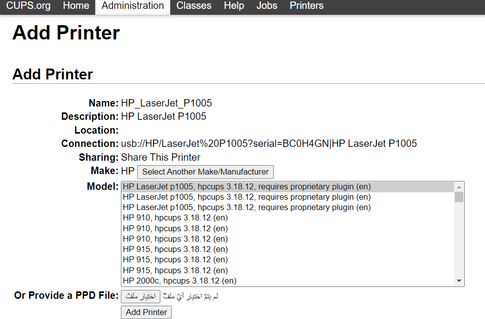 اختر الموديل المطابق لنوع طابعتك في هذا الدرس استخدمنا طابعة HP LaserJet P1005 ثم انقر على Add Printer.