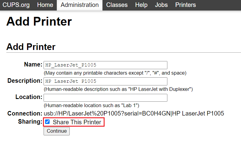 انقر على Share This Printer ثم Continue.