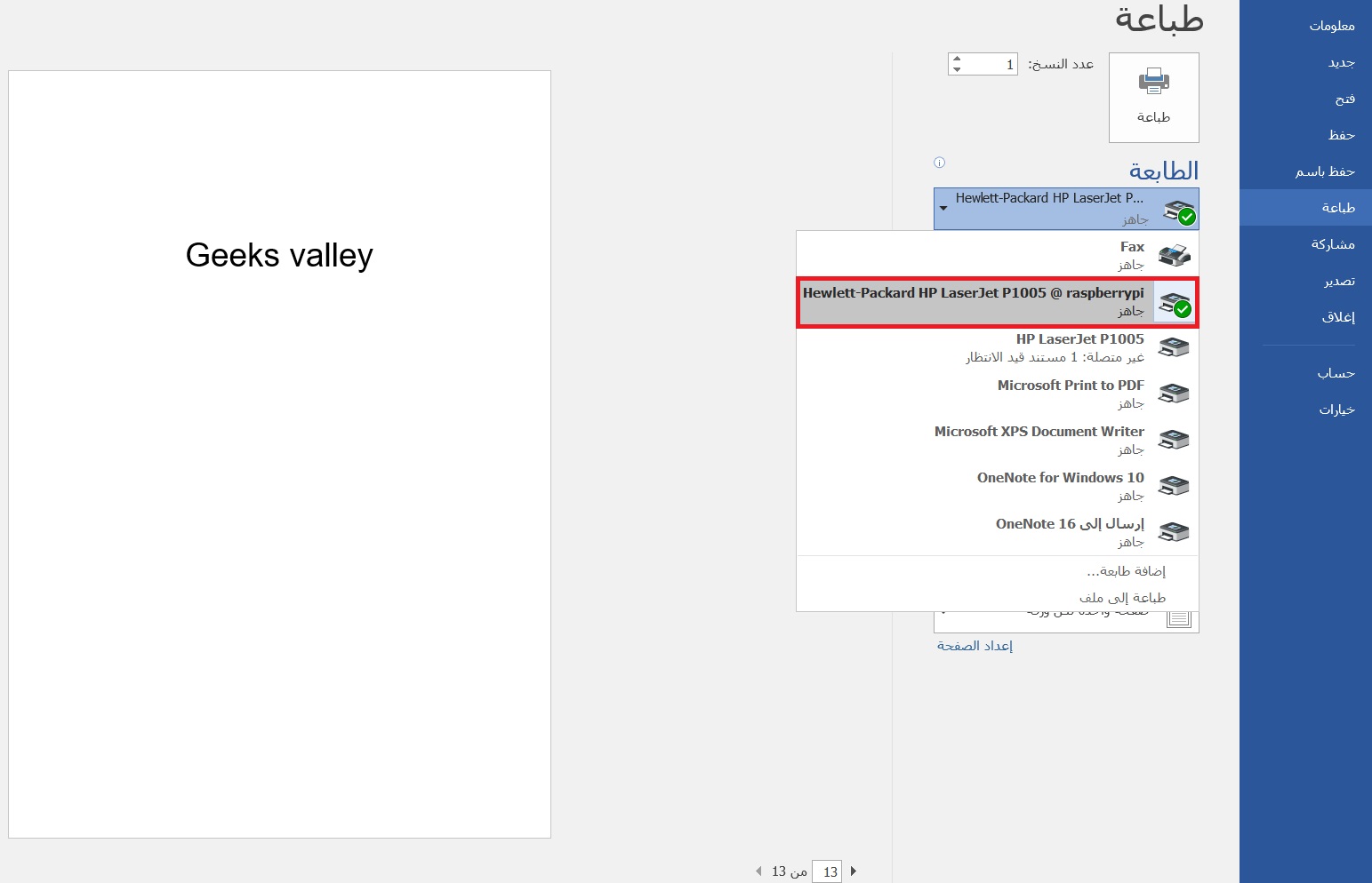 الآن يمكنك التحكم بالطابعة عن بعد، ستظهر مباشرة قائمة الطابعات اللاسلكية الموجودة في المكان انقر على الطابعة التي قمت بإضافتها في الخطوات السابقة.